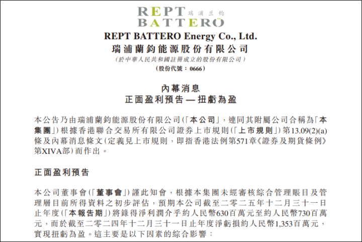 2月2日,瑞浦兰钧(00666.HK)发布盈利预喜公告。公告称根据本集团未经审核综合管理账目及管理层目前所得资料初步评估,预期本公司截至2025年12月31日,将录得净利润介乎约人民币6.3亿至约人民币7.3亿,而于截至2024年12月31日止年度净亏损约人民币13.53亿元,实现扭亏为盈。
